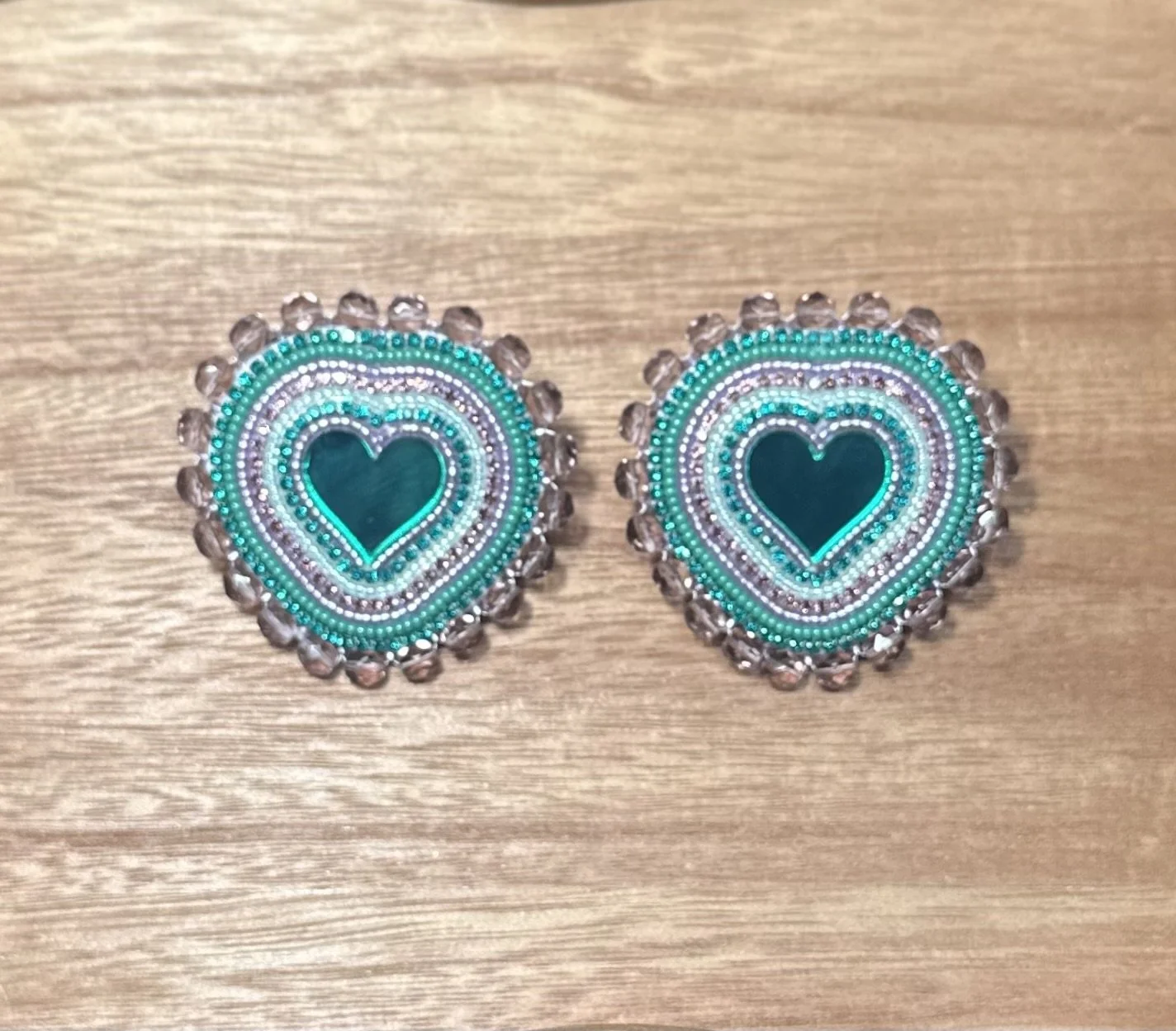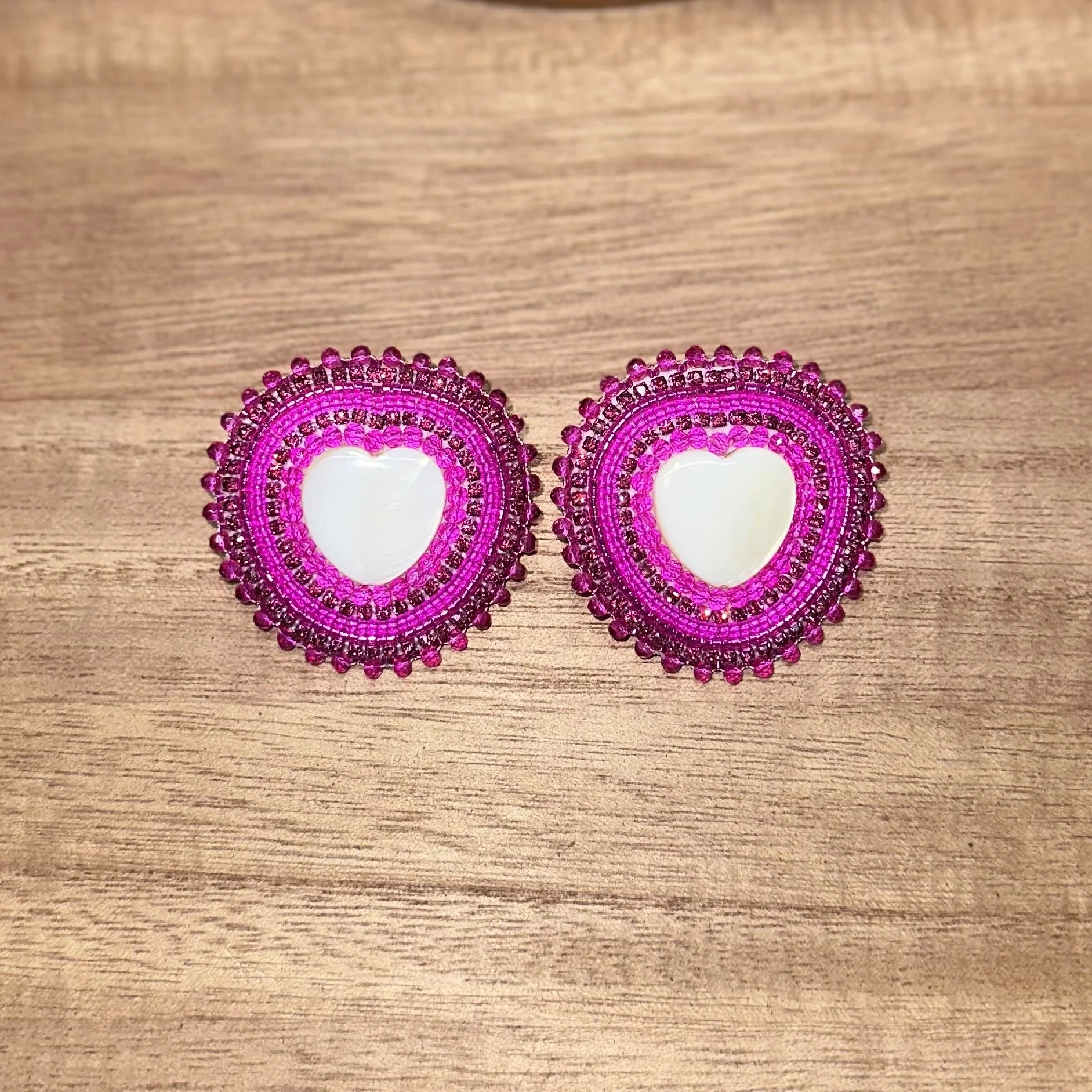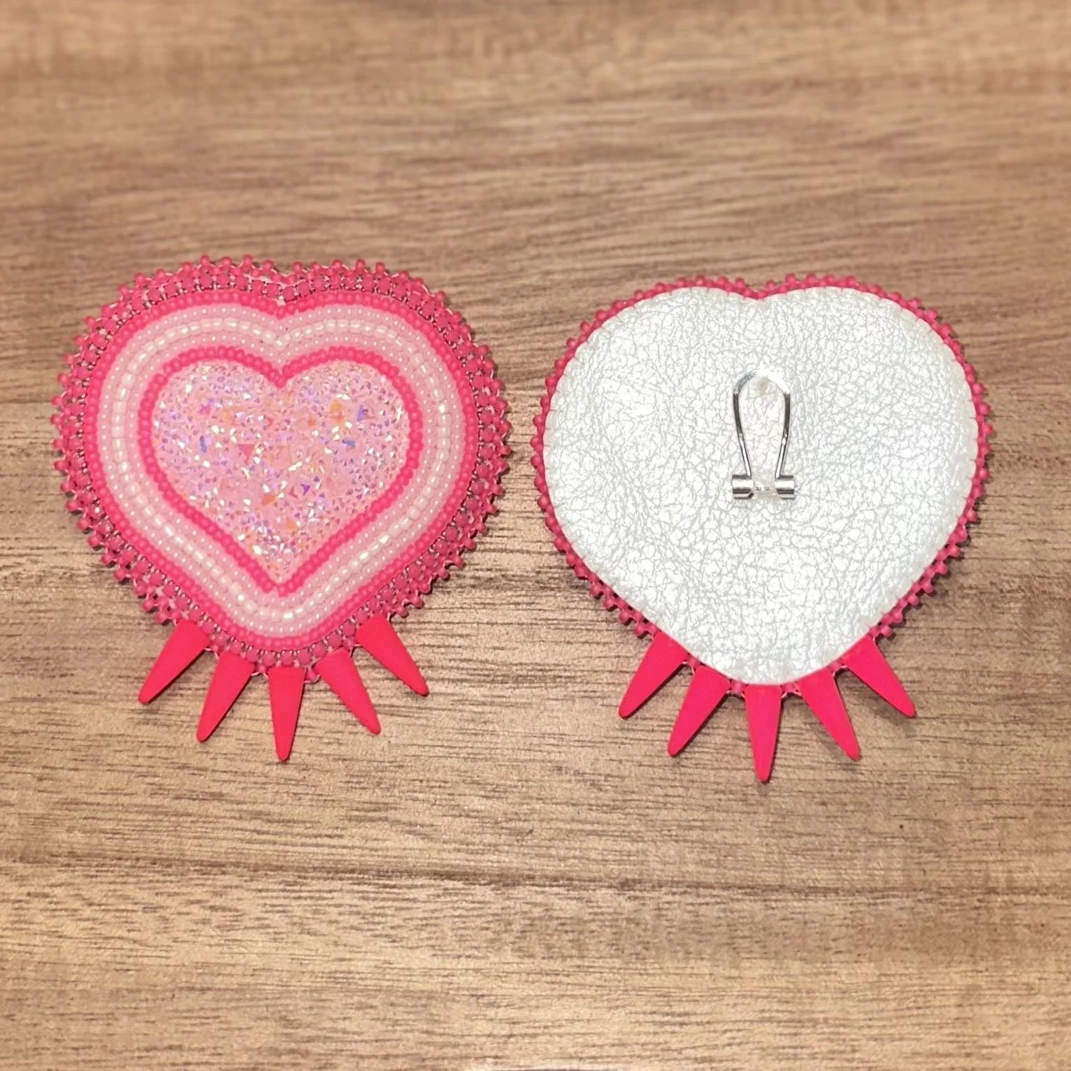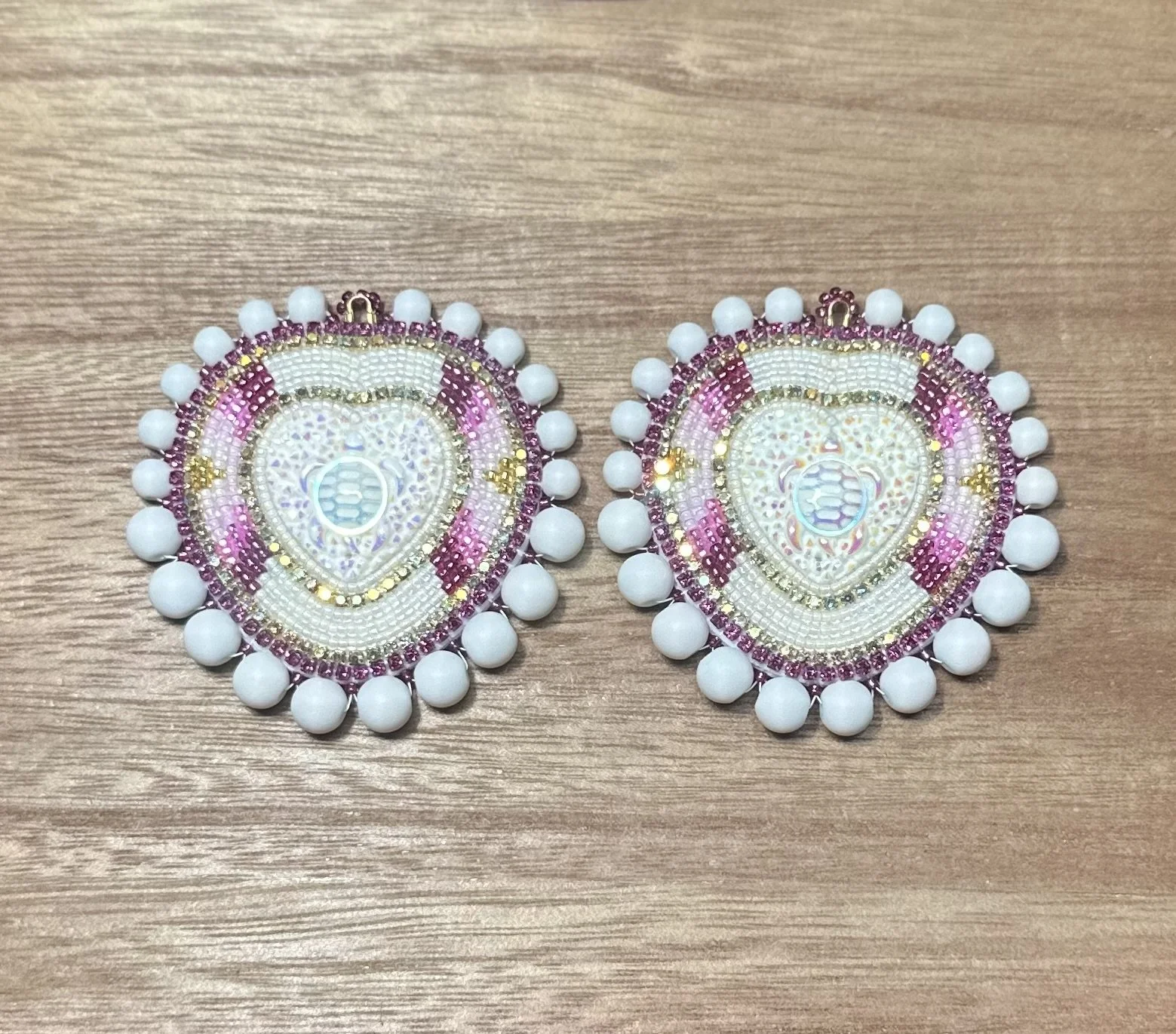 Pink Bear Paw Hearts. $70.00 White Turtle Hearts. $70.00 Emerald Heart Mirrors. $45.00 Orange Mother Of Pearl Studs. $45.00 Purple Tulip Feathers. $45.00 Gold dangles. $25.00 Black GhostFace Studs. $20.00 Brown Antler Dangles. $35.00 Blood Red Heart Studs. $30.00 Sold out Mint Crystals Studs. $40.00 Pink Studded Hearts. $50.00 Hot Pink Deer Antler Dangles. $55.00 Ruby Mother Of Pearl Hearts. $45.00 Fuchsia Mother Of Pearl Hearts. $45.00 Teal Flower Hearts. $55.00 White Green Beaded Hoops. $20.00 Cranberry Cream Beaded Hoops. $20.00 Pink Purple Mixed Hoops. $20.00 Black Beaded Hoops. $20.00 Dark Purple Beaded Hoops. $20.00